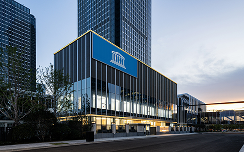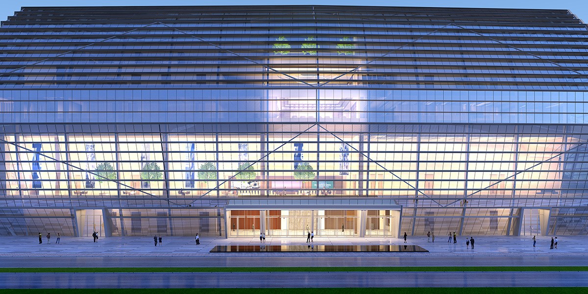 在建筑平面设计中,通过门的空间序列构建出“门藏天地阔,扉启家国兴”的空间形态;门厅设计寓意为“登门望府,恭迎天下宾客”;大厅整体造造型宛如拉开的序幕,寓意“揭开了新的幕布”,开始了一个新的阶段篇章;设计融入了“竹”、“印”、“檐”等中国传统元素,充分体现了中华文化,以现代手法诠释了“恭迎天下客”的待客之道。